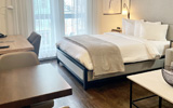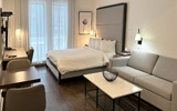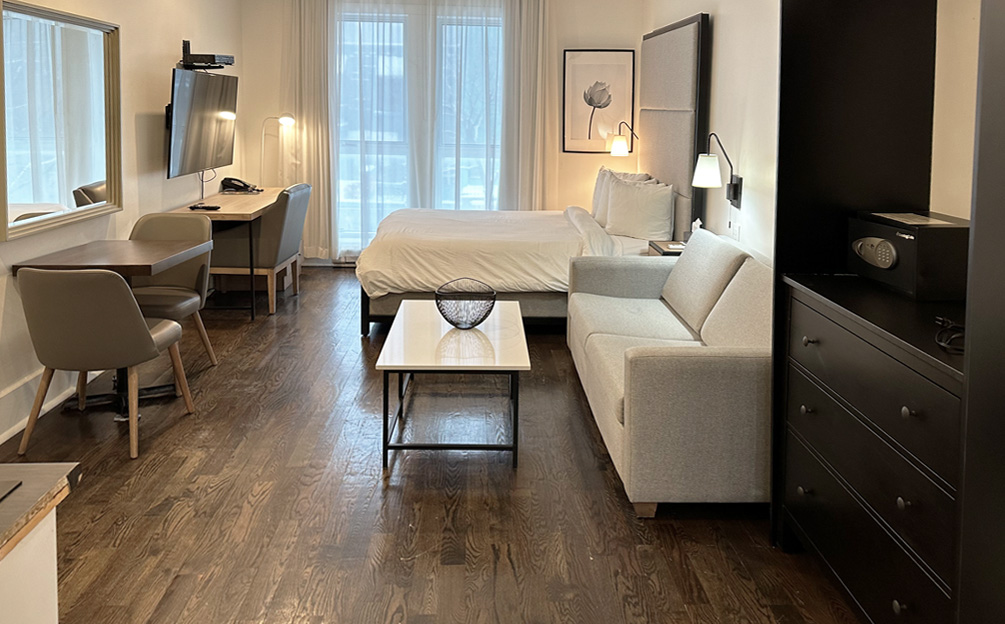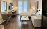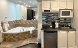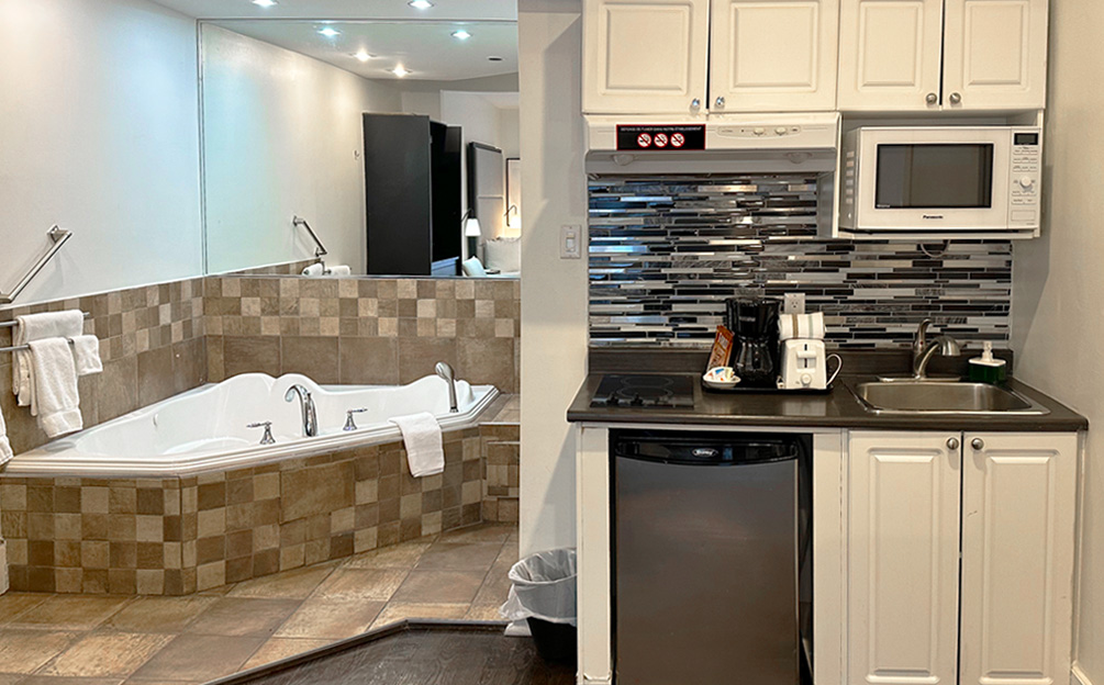 Notre chambre Supérieure Bain Tourbillon comprend également un coin séjour, un petit bureau de travail et un espace cuisine tout équipé à même la chambre avec plaque à induction, un mini-frigo, un micro-ondes et une cafetière.
