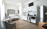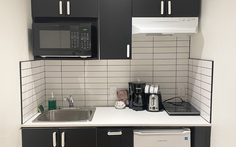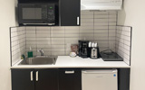 Nos chambres Exécutive comprennent également un espace cuisine tout équipé à même la chambre avec plaque à induction, un mini-frigo, un micro-ondes et une cafetière.